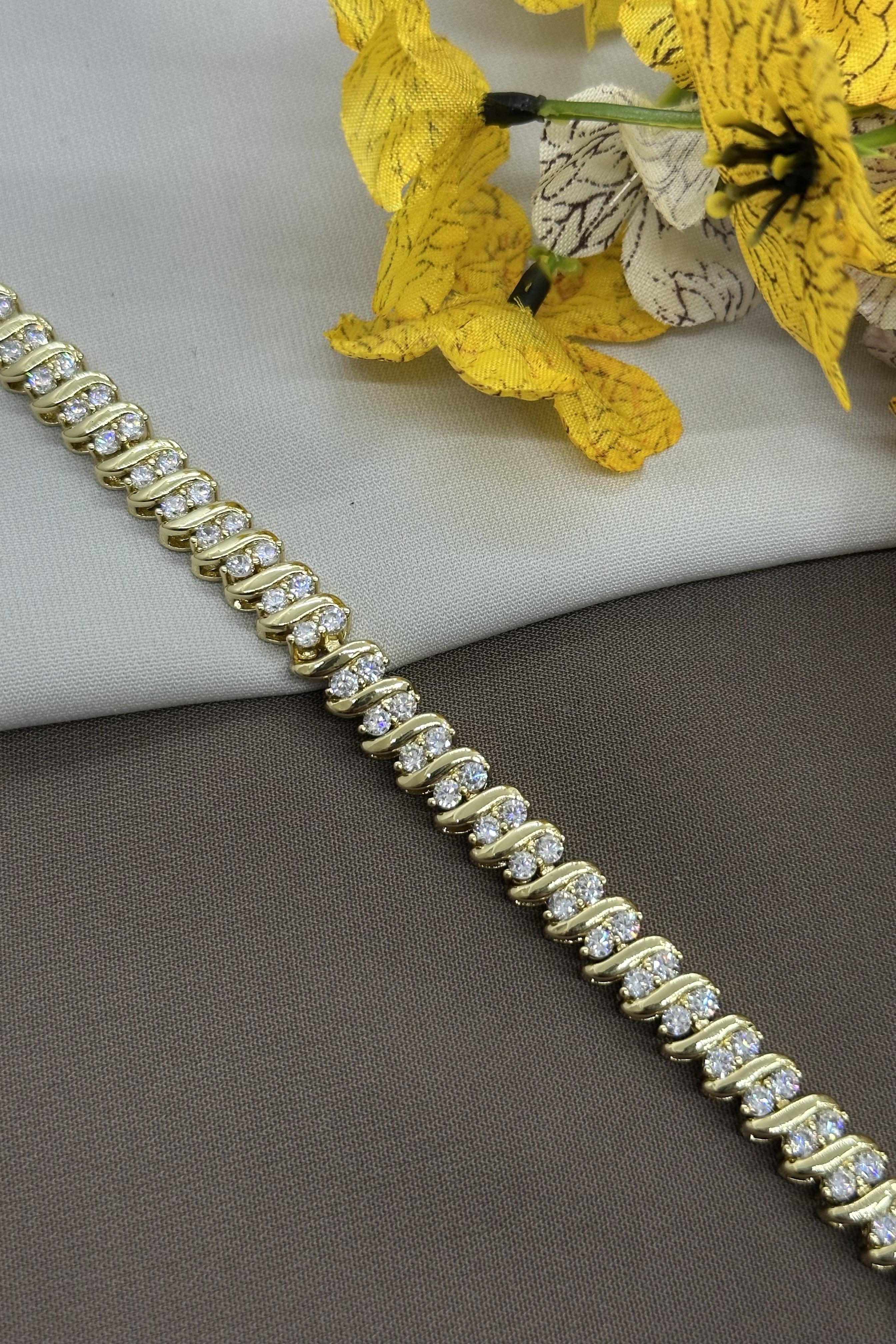 14K Çizgili Taşlı Gold Vıp Bileklik
