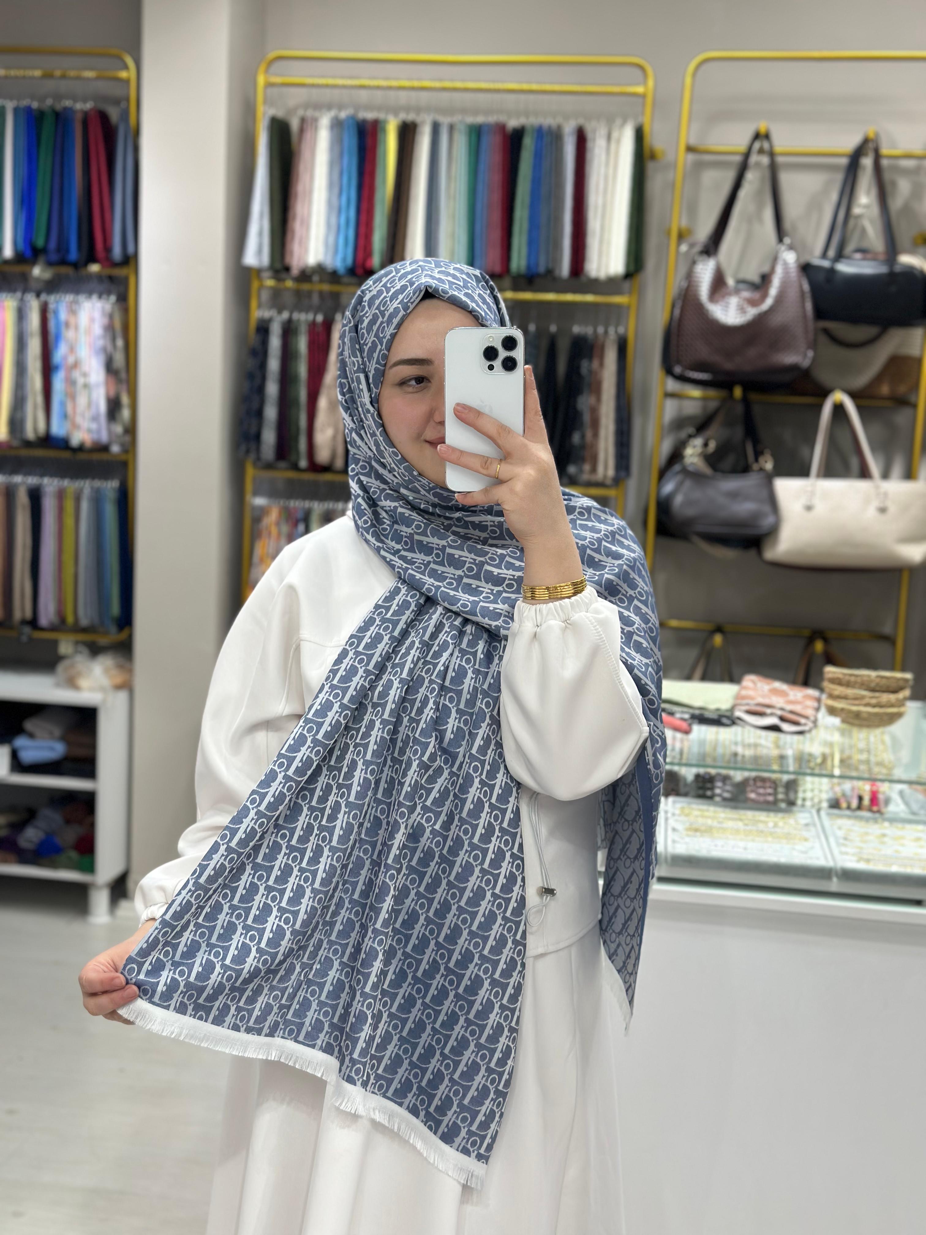 D*or Mavi-Beyaz Çift Taraflı İpek Kaşmir Şal